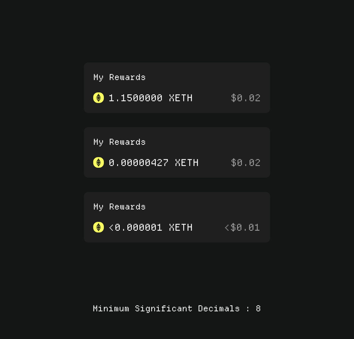 The idea is simple: as values increase, fewer decimals are needed to remain meaningful. Your UI should scale precision according to the value, ensuring users always see enough detail without being overwhelmed by noise.